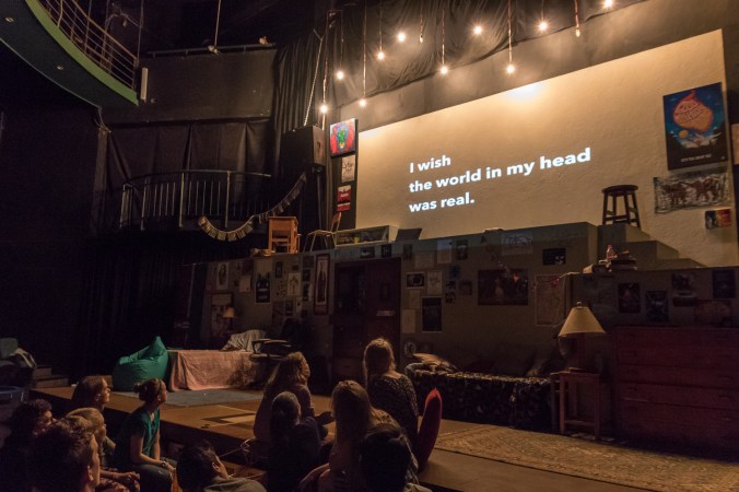 We created our show using the central arc of the original script – the tour through the brain and the structural elements of the play. This provided a really solid foundation from which to build. In the end, though, perhaps as much as 75% of the script was our own words. We found that, even though we were sticking with the underlying purpose of each scene, most of the text needed to be rewritten to suit our actors – their personalities and cultures and the specifics of their lives. Certain speeches and segments were so beautifully crafted in the original that I kept them word for word (such as the You Say to Me speech used in the voiceover of the Company Three trailer – so beautiful, why would you mess with that?). Others were preserved at a conceptual level, but rewritten by the student or students presenting them, to bring their own voices forward in a more authentic way.