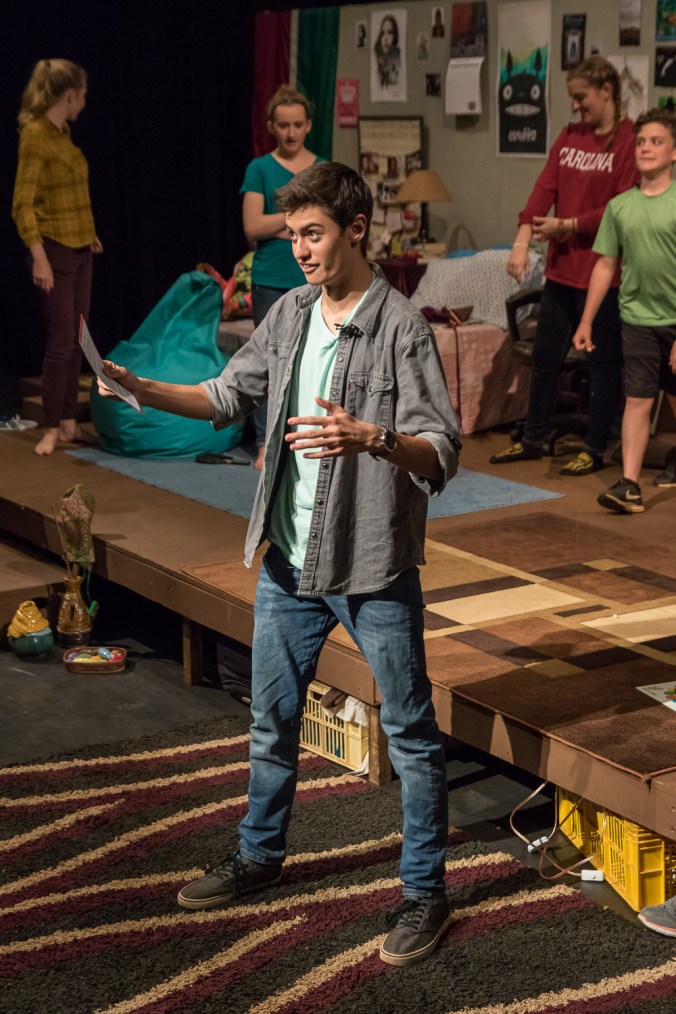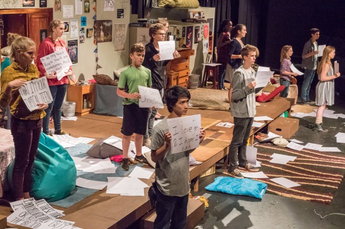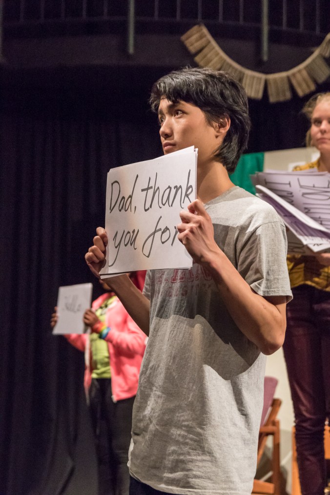 One part of the process that really made me nervous in advance was workshopping the scenes of conflict between the kids and their parents. Cast members had written first drafts of scenes depicting real conflicts they’d regularly experienced with their parents. I was pleased by the variety of scenes the students brought – some very funny or warm, others uncomfortable and quite angry. I edited and polished these scenes and selected a suitable cast member to play the parent. Once the scene had been rehearsed for a bit, we invited the parents into a 20-minute workshop. This worried me. I feared that parents might get offended – most hadn’t seen the scripts at all. We had a friend, a family therapist, join us in these sessions (just in case). To my delight, all of the parents were great sports. The kids ran the scene, we asked mum or dad for their initial thoughts, then they stepped in and did a cold reading of the scene with their own child. (This was so instructive – and hilarious.) We filmed those for later reference. After this, the student playing the parent asked questions. “When you said X, how were feeling?” … ”You seemed so angry at that point. Why?” This opened up wonderful opportunities for parents and their kids to talk about these ongoing arguments they have, and, I think, to gain some insight into how the other feels and experiences those moments of tension.