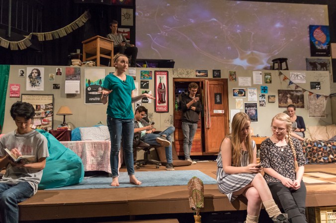 I also had to deal with my own self-doubts. I’d never done a devised show before, and desperately wanted to do justice to this subject and to my students. Can I gather all of these pieces collected over many weeks, and fit them together into something theatrically coherent and beautiful? The fear of failure caused numerous 4:00am wake-ups, ‘dark nights of the soul’. However, with the comfort and benefit of hindsight, I can assure any directors aspiring to dive into devised theatre that Brainstorm is the perfect entry point. The script’s ‘blueprint’ section is really helpful, providing dozens of ideas for activities, writing prompts, games, and processes to assist a company wanting to create their own version. This made the process much easier for me than starting with a blank slate.