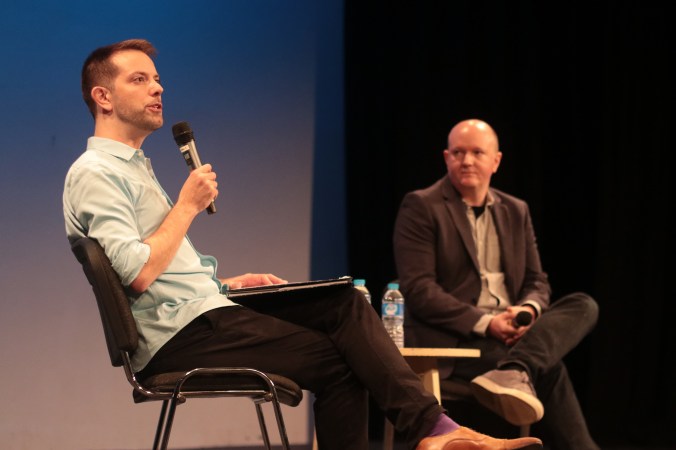Matt Applewhite interviewing NHB author Mike Bartlett at Amateur Theatre Fest, September 2018 (photo by Ben Copping)