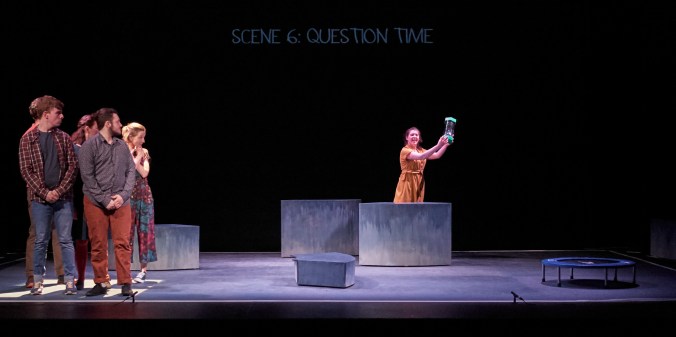 During each ‘Question Time’ scene, the audience can ask any questions they like, while one cast member times the scene with a giant egg timer (photo Ros Kavanagh)